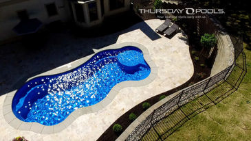 Curvy and vivacious living starts here. The freeform Wellspring fiberglass pool is everyone’s go-to spot for good times. It’s the perfect size and shape for an accessory like a pool slide. So much fun!
